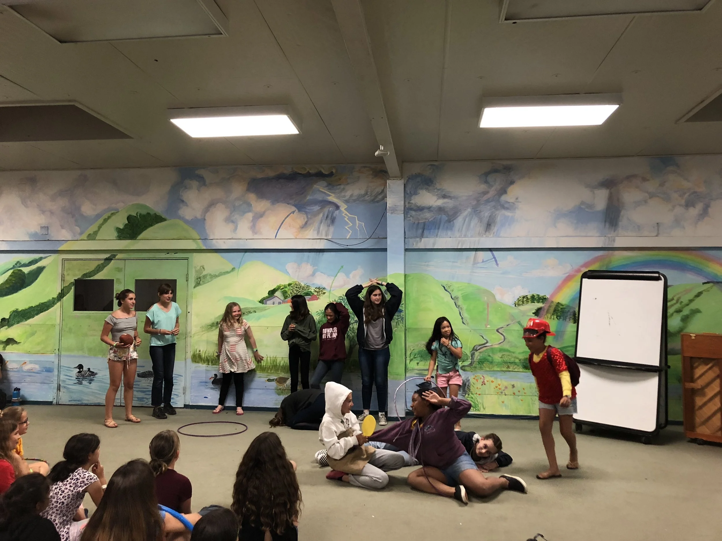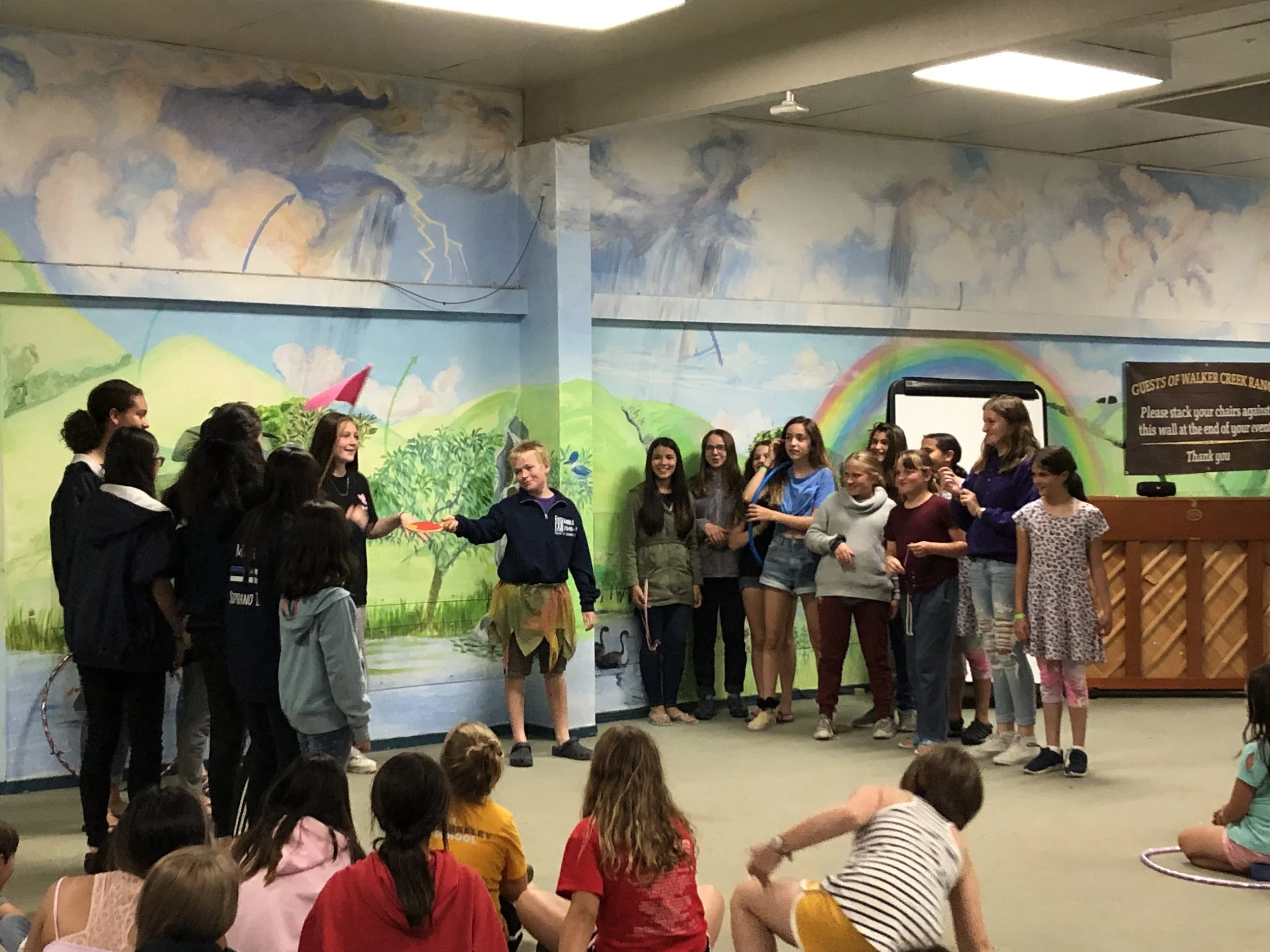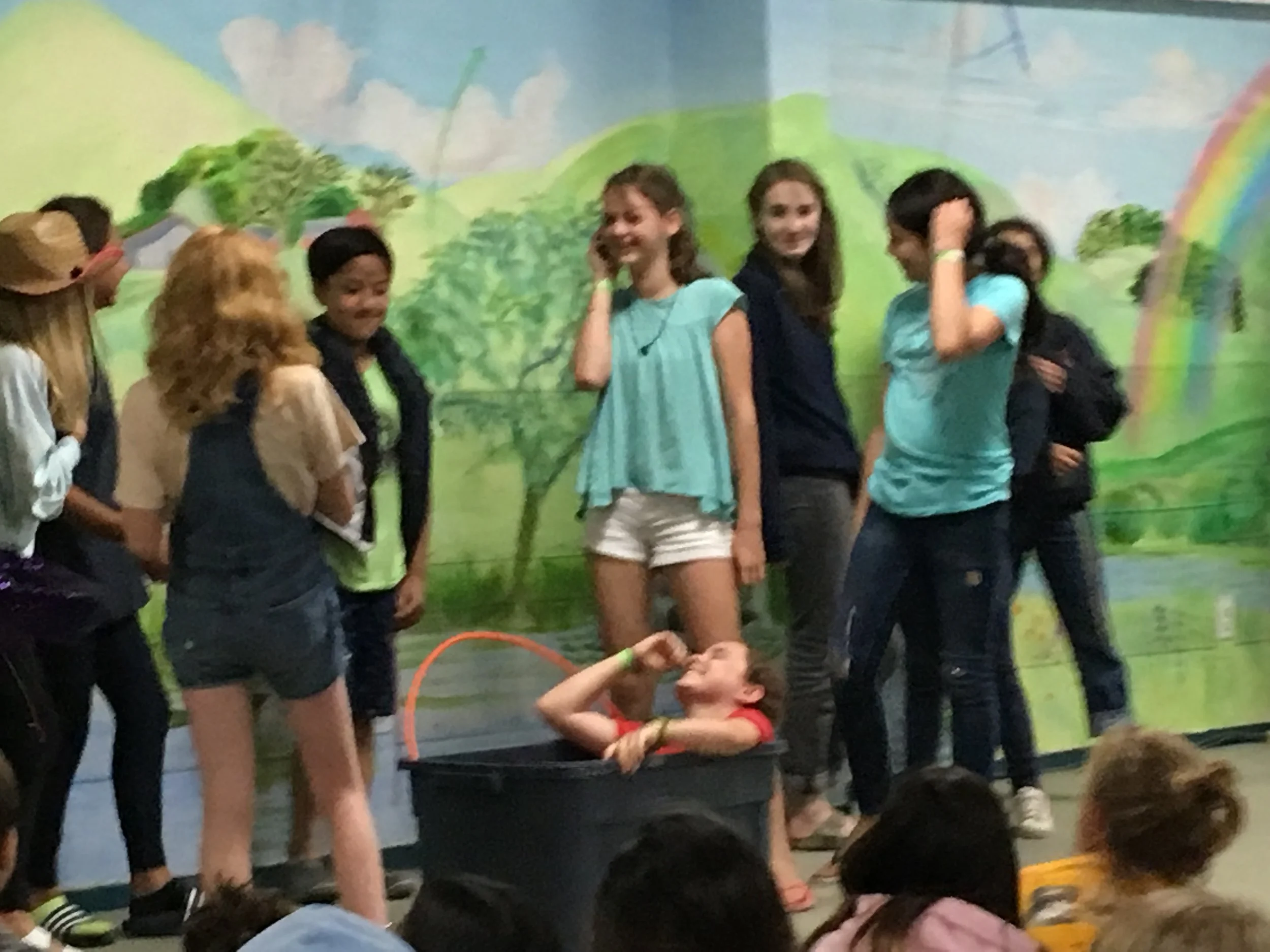 After a restful night's sleep of recuperation from Break Day yesterday, campers awoke this morning ready to return to our regular choir camp schedule. Breakfast at 8:00 preceded 15-minute Warm Ups with Mr. Brown, after which campers went to their theory classes. In "Chill Dude Theory," (a name chosen by campers last year!) one of six classes staff are teaching, children solidified their knowledge of dotted notes, practiced rhythmic dictation, and learned about sharp key signatures. Before a lunch of tacos, Concert Choir and Ensemble had their first rehearsals of the day. Mr. Brown noted that despite the expected Break Day-tiredness, CC singers put in a lot of energy and sang very well. Rest Period today, which is a daily tradition of silent time in beds after lunch, was "mandatory rest." This means that campers had to try to take a nap during the hour so that everyone could put in their best effort throughout the rest of the day. Singers participated in bookmark making, the Arts and Crafts activity of the day, and additonally took this time to make cards for each other and their families. Managing their own schedules, they also balanced pond time with voice lessons and sectional practices. Training Department camp, Camp Joyful Voices, had lots of fun today playing games with their wonderful leader Miss Anne and going up to the pond. Their counselors danced and broke into song with them on the walk over, and they took full advantage of the boats and other water activities available. After free time, recital was an exceptional display of staff and camper talent alike. Among these acts were four counselors who performed Maestro Eric Tuan's lovely arrangement of the traditional folk song "Shenandoah." Dinner was fetuccine alfredo with brownies for dessert, and then campers headed off for their second and final rehearsal of the day. Around 8pm both CC and Ensemble gathered for the nightly activity, Opera in a Bag. This camp tradition is a ridiculously silly opportunity for singers to not only engage their creativity, but to mingle with their fellow campers! The rules of the game are as follows: all children are divided into six groups and sent off to different locations that contain sundry props pre-chosen (with utter mirth!) by counselors - some fun ones included hula hoops, a plastic bin lid, the book Gulliver's Travels, and various crazy stage costumes. Each group had 20 minutes to incorporate each prop into a short operatic skit. Every camper must have a role in each of these performances, all dialogue must be sung or chanted, and they must also incoporate two of four phrases: friendship bracelet, whimsical, bridge troll, and/or Dr. Greg. The end result were six unique mini-operas, full of last minute improvisations, giggles, and much audience appreciation. Camp Joyful Voices had their own enjoyable game of "Red Light/Green Light" with their CITs, and successfully made it through their first full day of camp! Upon concluding the nightly fun, content campers drifted off to their cabins for another night's sleep to bring in a new day of music and laughter.