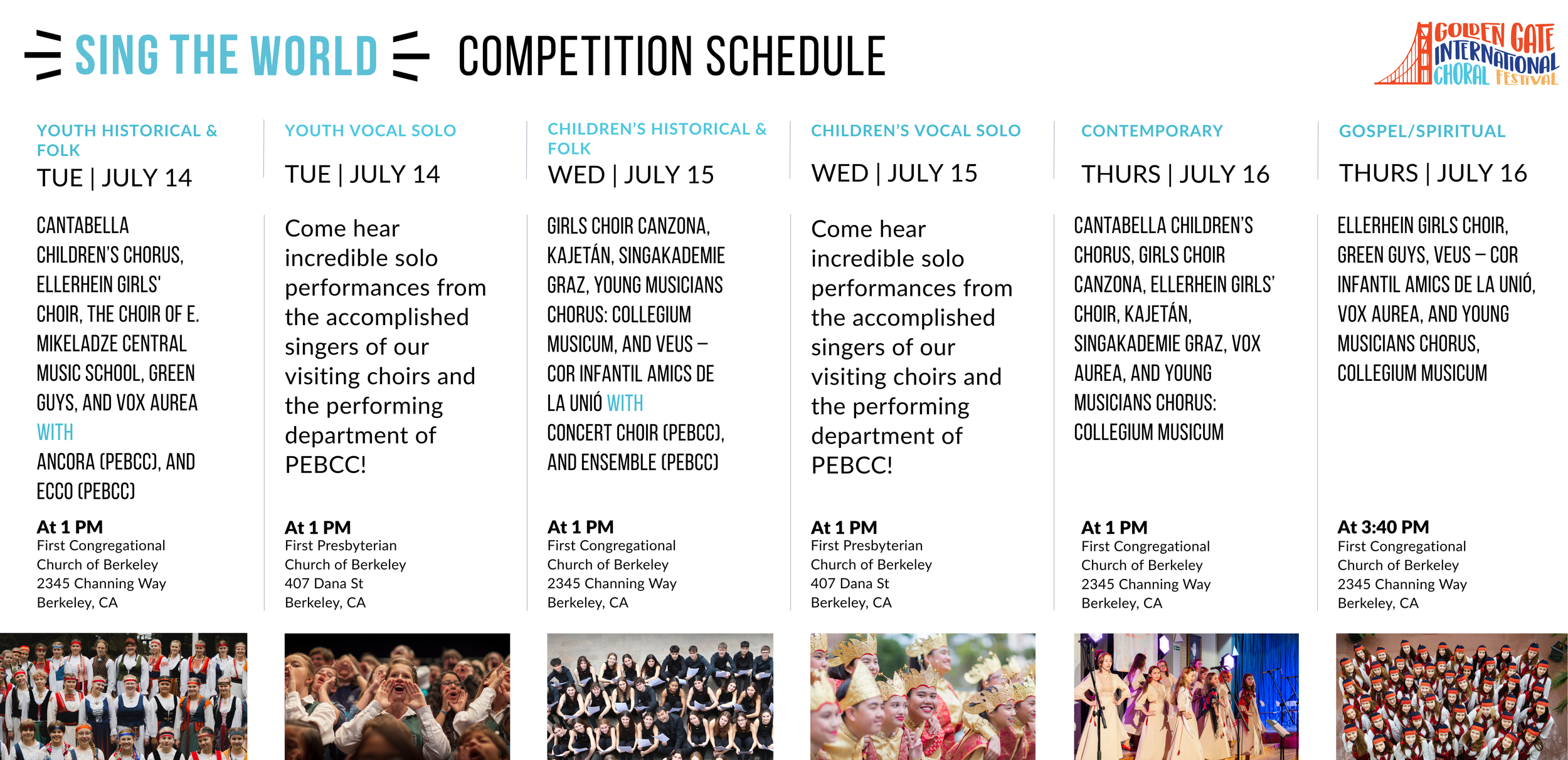 Jul 16 1:00 PM13:00 Contemporary Competition Thursday, July 16, 2026 1:00 PM 3:30 PM 13:00 15:30 First Congregational Church of Berkeley (map) Google Calendar ICS View Event →