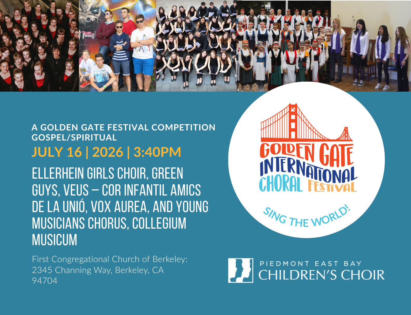 Competing Choirs: Ellerhein Girls Choir (Estonia), Green Guys (Austria), Veus – Cor Infantil Amics de la Unió (Catalonia), Vox Aurea (Finland), and Young Musicians Chorus: Collegium Musicum (USA).